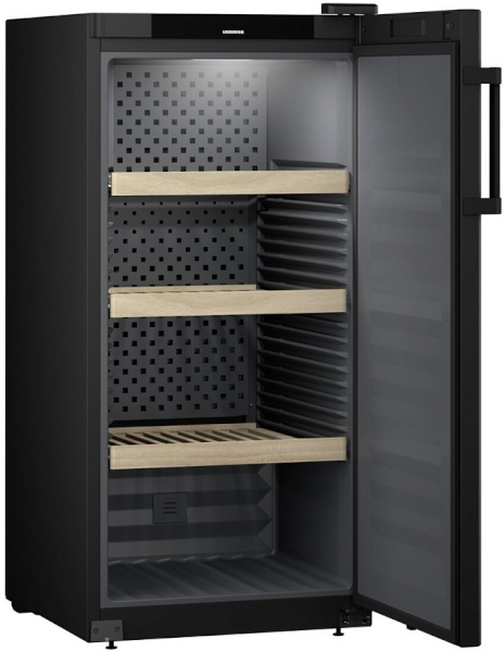 Винный шкаф Liebherr WSbl 4201 — изысканная модель, которая станет превосходным дополнением к вашей кухне или гостиной. Корпус и непрозрачная дверь выполнены из нержавеющей стали. Этот материал отличается долговечностью и надежностью. Эргономичная ручка, расположенная справа, позволяет без труда пользоваться устройством. В качестве основного цвета выбран глубокий черный оттенок с матовым покрытием. Элегантный и эстетичный дизайн подойдет к любому интерьеру. Полки изготовлены из натурального дерева. Управление осуществляется через электронный дисплей в верхней части дверцы. С его помощью можно точно настроить температуру в диапазоне от 5 до 20 градусов.