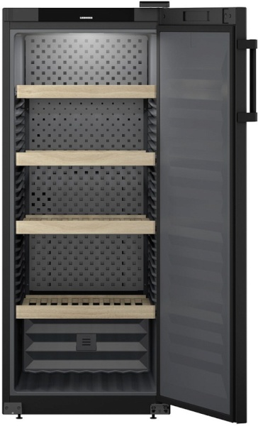 Винный шкаф Liebherr WSbl 4601 — элегантная модель, которая сочетает в себе стильный внешний вид и высокую функциональность. Дизайн выполнен в эстетике минимализма с использованием прямых плавных линий и и гладких поверхностей. В качестве основного оттенка выбран матовый черный. Покрытие корпуса сделано из надежной нержавеющей стали, а полки изготовлены из натурального дерева. Классическое сочетание древесной текстуры и черного цвета делает внешний вид устройства эстетичным и изящным. Панель управления находится в верхней части дверцы и представляет из себя дисплей и кнопки для точной настройки температуры.